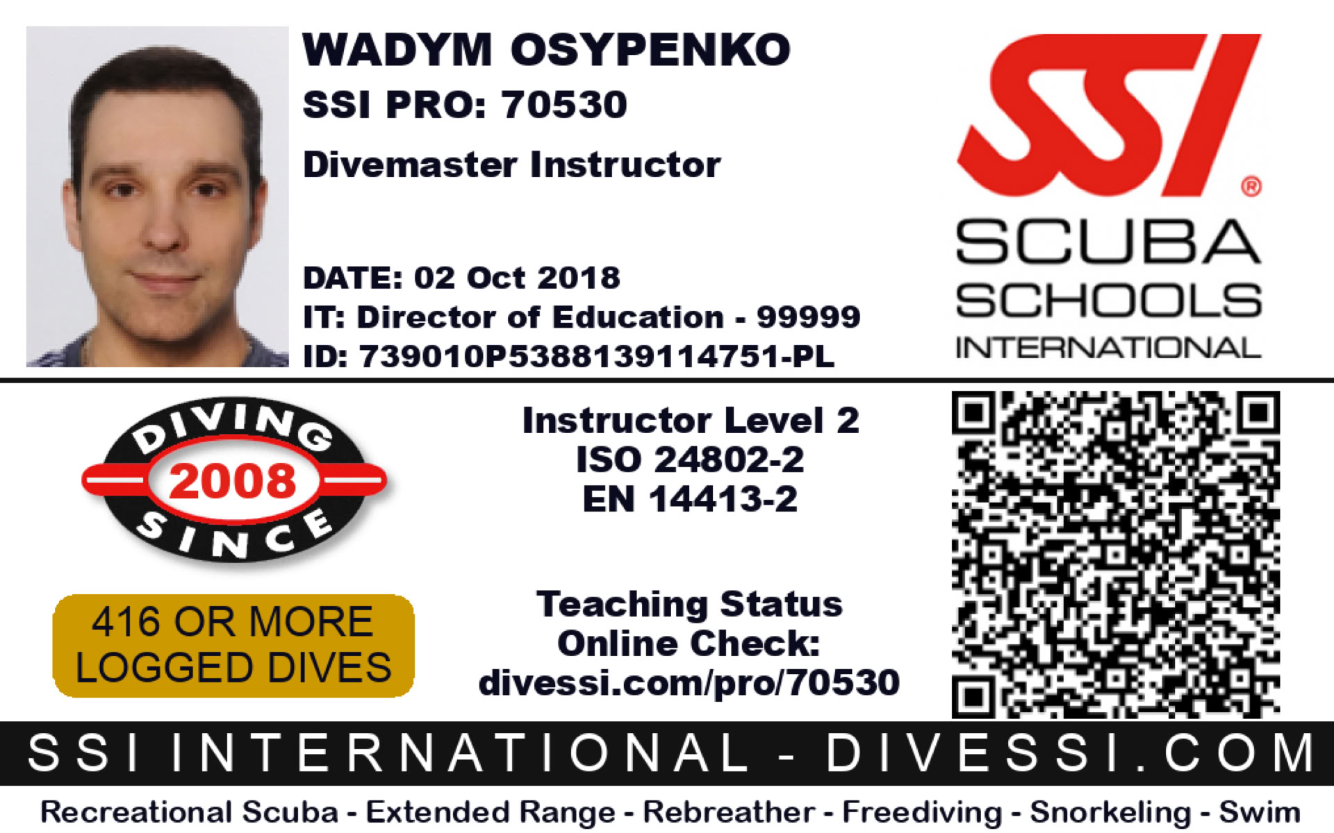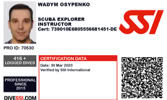 W 2016 zdobył uprawienia instruktora freedivingu SSI. W tytonie prowadzi głównie szkolenia w Rosyjskim i Polskim języku. W nurkowaniu stara się zdobywać nowe doświadczenia oraz poszerzać dotychczasową wiedzę i zarażać nią innych.